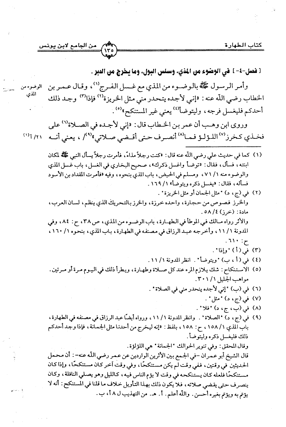 وأمر الرسول صلى الله عليه وسلم بالوضوء من المذي مع غسل الفرج، وقال عمر بن الخطاب رضي الله عنه: ((إني لأجده يتحدر مني مثل الخريزة فإذا وجد ذلك أحدكم فليغسل فرجه، وليتوضأ يعني غير المستنكح)).