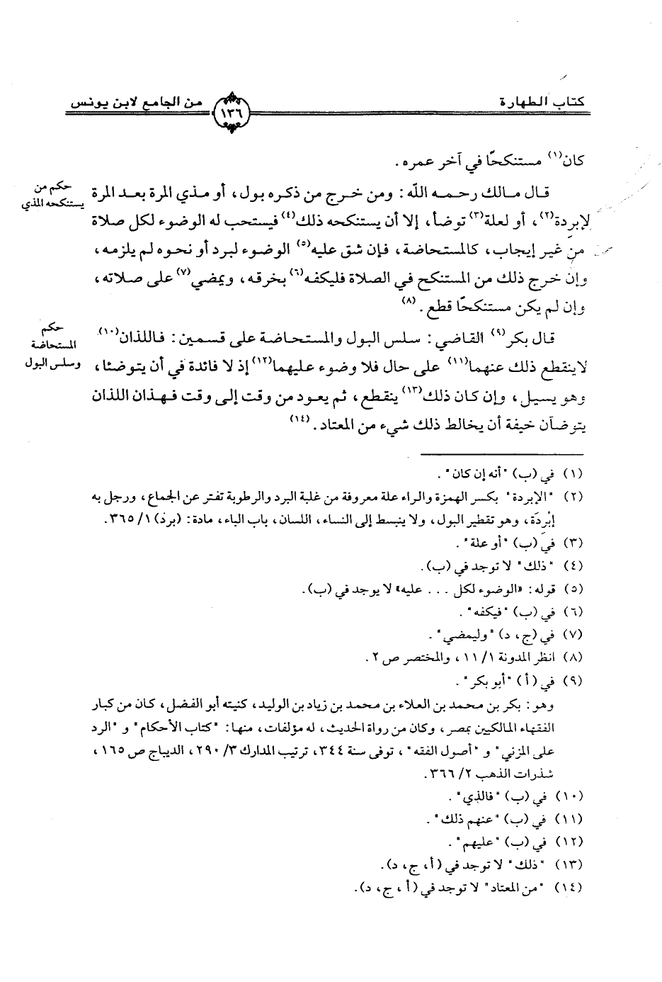 قال بكر القاضي: سلس البول والمستحاضة على قسمين: فاللذان لا ينقطع ذلك عنهما على حال فلا وضوء عليهما إذ لا فائدة في أن يتوضئا، وهو يسيل، وإن كان ذلك ينقطع، ثم يعود من وقت إلى وقت فهذان اللذان يتوضآن خيفة أن يخالط ذلك شيء من المعتاد.