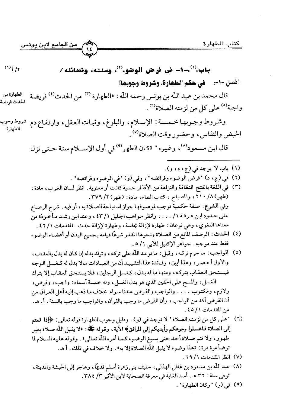 قال محمد بن عبد الله من يونس رحمه الله: ((الطهارة من الحدث فريضة واجبة على كل من لزمته الصلاة)).