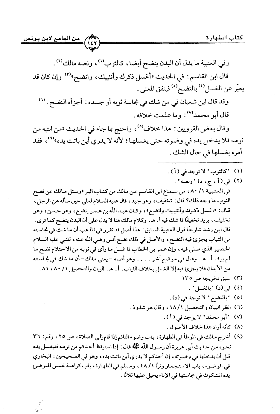 قال ابن القاسم: في الحديث ((غسل ذكرك وأنثييك، وانضح)) وإن كان قد يعبر عن الغسل بالنضح فيتفق المعنى.