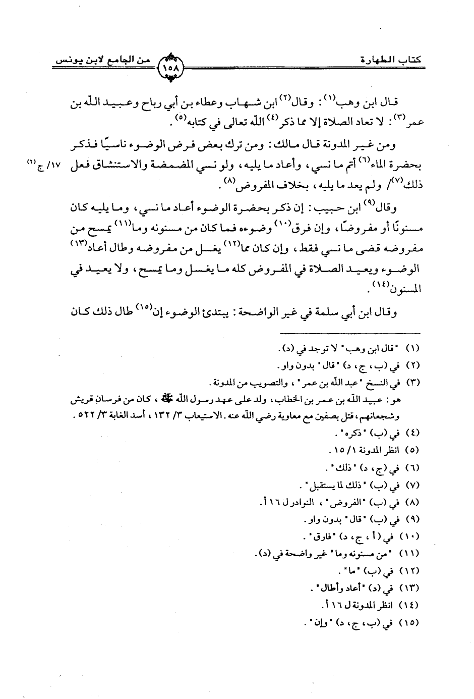 وقال ابن حبيب: إن ذكر بحضرة الوضوء أعاد ما نسي، وما يليه كان مسنوناً أو مفروضاً، وإن فرق وضوءه فما كان من مسنونه وما يمسح من مفروضه قضى ما نسي فقط، وإن كان مما يغسل من مفروضه وطال أعاد الوضوء ويعيد الصلاة في المفروض كله ما يغسل وما يمسح، ولا يعيد في المسنون.