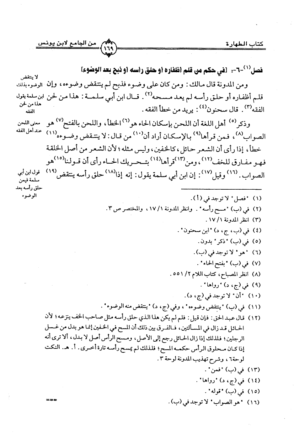 وذكر أهل اللغة أن اللحن بإسكان الحاء هو الخطأ، واللحن بالفتح هو الصواب، فمن قرأها بالإسكان أراد أن من قال: لا ينتقض وضوءه خطأ، إذا رأى أن الشعر حائل، كالخفين، وليس مثله؛ لأن الشعر من أصل الخلقة فهو مفارق للخف، ومن قرأها بتحريك الحاء رأى أن قولنا هو الصواب. وقيل: إن ابن أبي سلمة يقول: إنه إذا حلق رأسه ينتقض