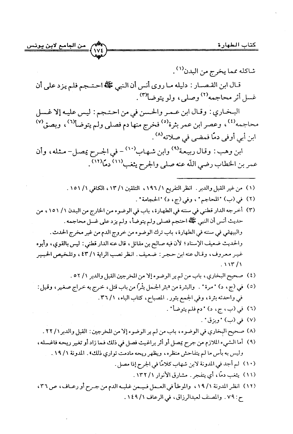 البخاري: وقال ابن عمر والحسن في من احتجم: ليس عليه إلا غسل محاجمه، وعصر ابن عمر بثرة فخرج منها دم فصلى ولم يتوضأ، وبصق ابن أبي أوفى دمًا فمضى في صلاته.