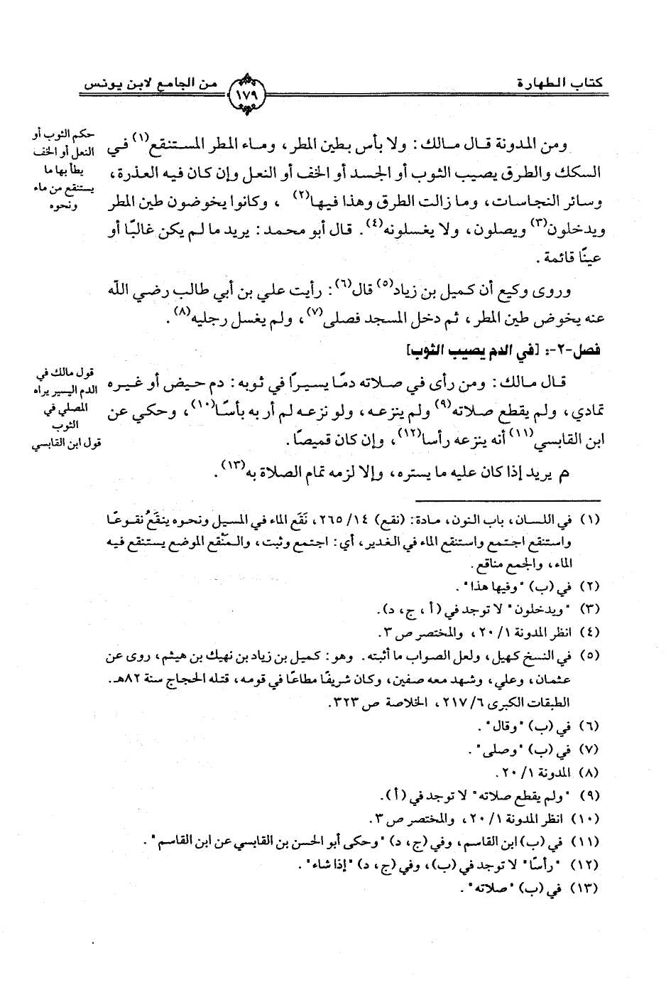 ومن المدونة قال مالك: ولا بأس بطين المطر، وماء المطر المستنقع في السكك والطرق يصيب الثوب أو الجسد أو الخف أو النعل وإن كان فيه العذرة، وسائر النجاسات، ومازالت الطرق وهذا فيها، وكانوا يخوضون طين المطر ويدخلون ويصلون، ولا يغسلونه، قال أبو محمد: يريد ما لم يكن غالبًا أو عينًا قائمة.