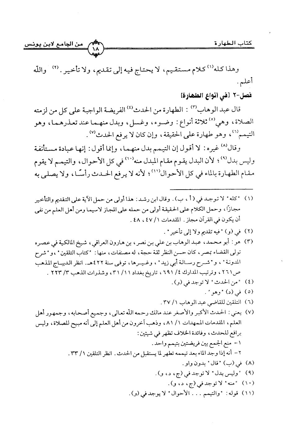 قال عبد الوهاب: الطهارة من الحدث الفريضة الواجبة على كل من لزمته الصلاة، وهى ثلاثة أنواع: وضوء، وغسل، وبدل منهما عند تعذرهما، وهو التيمم، وهو طهارة على الحقيقة، وان كان لا يرفع الحدث.