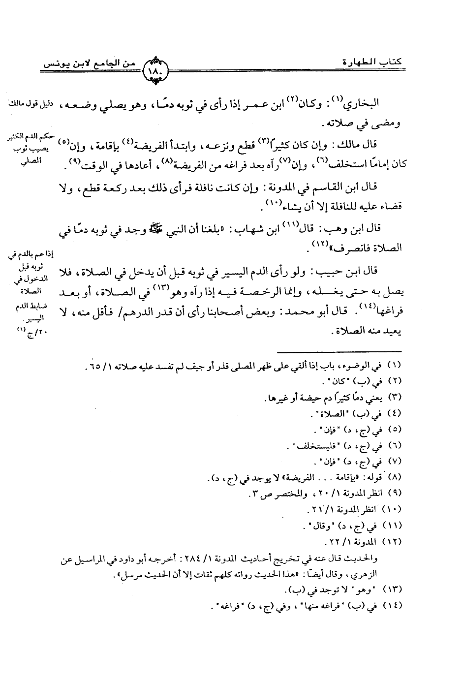 قال ابن حبيب: ولو رأى الدم اليسير في ثوبه قبل أن يدخل في الصلاةـ، فلا يصل به حتى يغسله، وإنما الرخصة فيه إذا رآه وهو في الصلاة، أو بعد فراغها، قال أبو محمد: وبعض أصحابنا رأى أن قدر الدرهم فأقل منه، لا يعيد منه الصلاة.