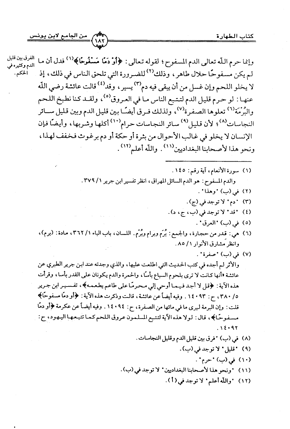 وإنما حرم الله تعالى الدم المسفوح؛ لقوله تعالى: (أَوْ دَمًا مَسْفُوحًا) فدل أن ما لم يكن مسفوحاً حلال طاهر، وذلك للضرورة التي تلحق الناس في ذلك، إذ لا يخلو اللحم وإن غسل من أن يبقى فيه دم يسير، وقد قالت عائشة رضي الله عنها: لو حرم قليل الدم لتتبع الناس ما في العروق، ولقد كنا نطبخ اللحم والبُرْمَة تعلوها الصفرة، ولذلك فرق أيضًا بين قليل الدم وبين قليل سائر النجاسات؛ لأن قليل سائر النجاسات حرام أكلها وشربها، وأيضًا فإن الإنسان لا يخلو في غالب الأحوال من بثرة أو حكة أو دم برغوث فخفف لهذا، ونحو هذا لأصحابنا البغداديين. والله أعلم.