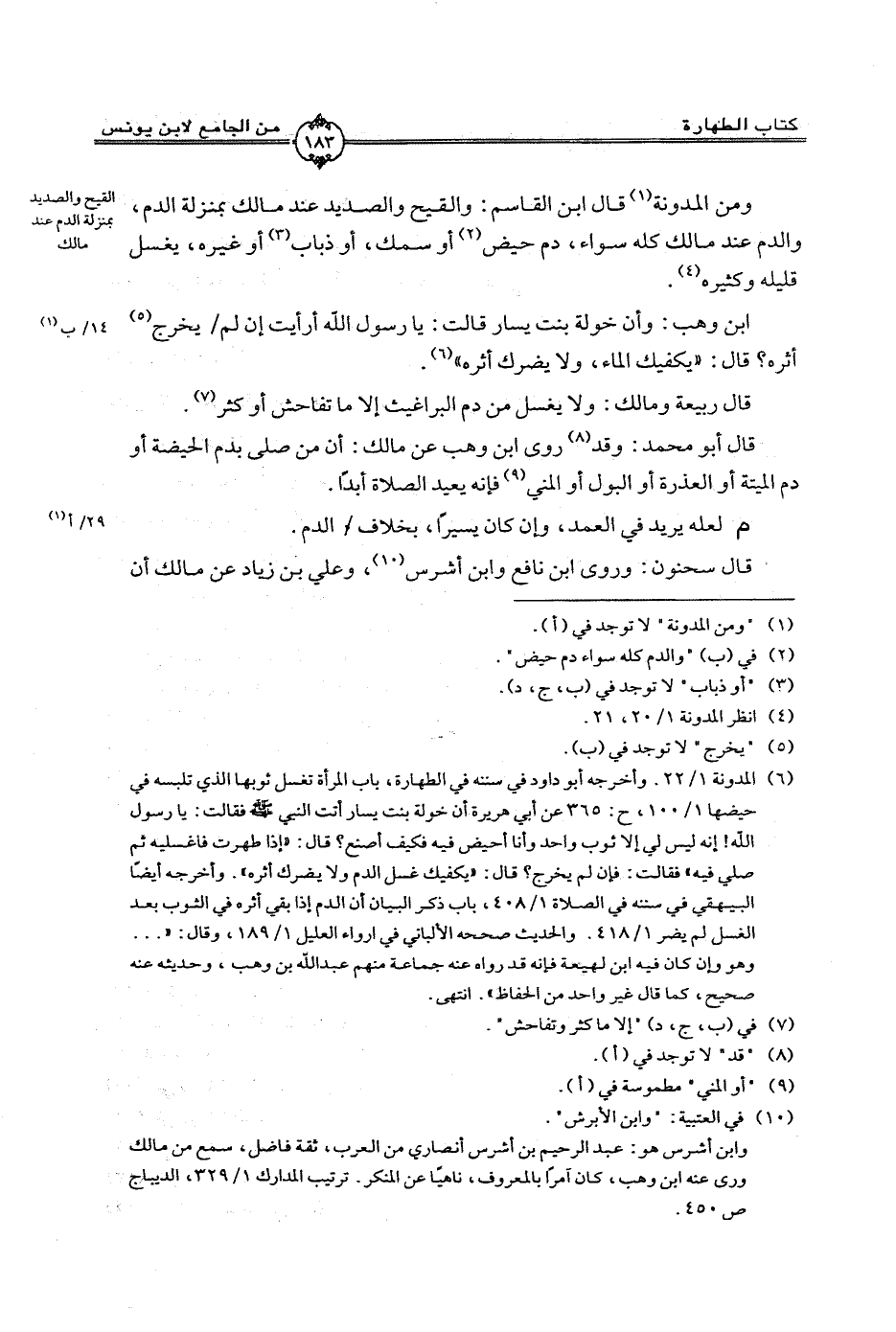 ومن المدونة قال ابن القاسم: والقيح والصديد عند مالك بمنزلة الدم، والدم عند مالك كله سواء، دم حيض أو سمك، أو ذباب أو غيره، يغسل قليله وكثره.