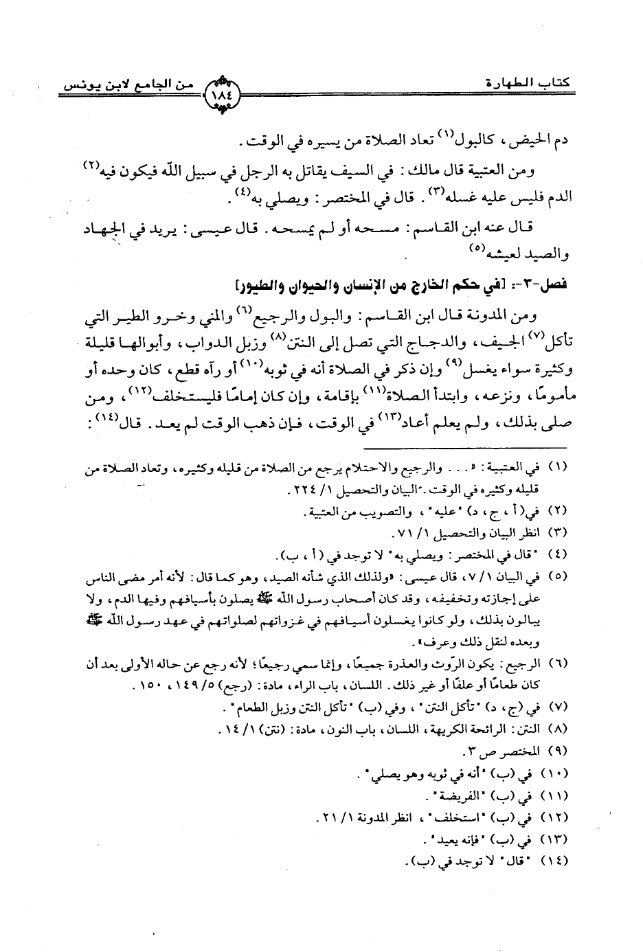 ومن المدونة قال ابن القاسم: والبول والرجيع والمني وخرو الطير التي تأكل الجيف، والدجاج التي تصل إلى النتن وزبل الدواب، وأبوالها قليلة وكثيرة سواء يغسل وإن ذكر في الصلاة أنه في ثوبه أو رآه قطع، كان وحده أو مأمومًا، ونزعه، وابتدأ الصلاة بإقامة، وإن كان إماماً فليستخلف، ومن صلى بذلك، ولم يعلم أعاد في الوقت، فإن ذهب الوقت لم يعد، قال: