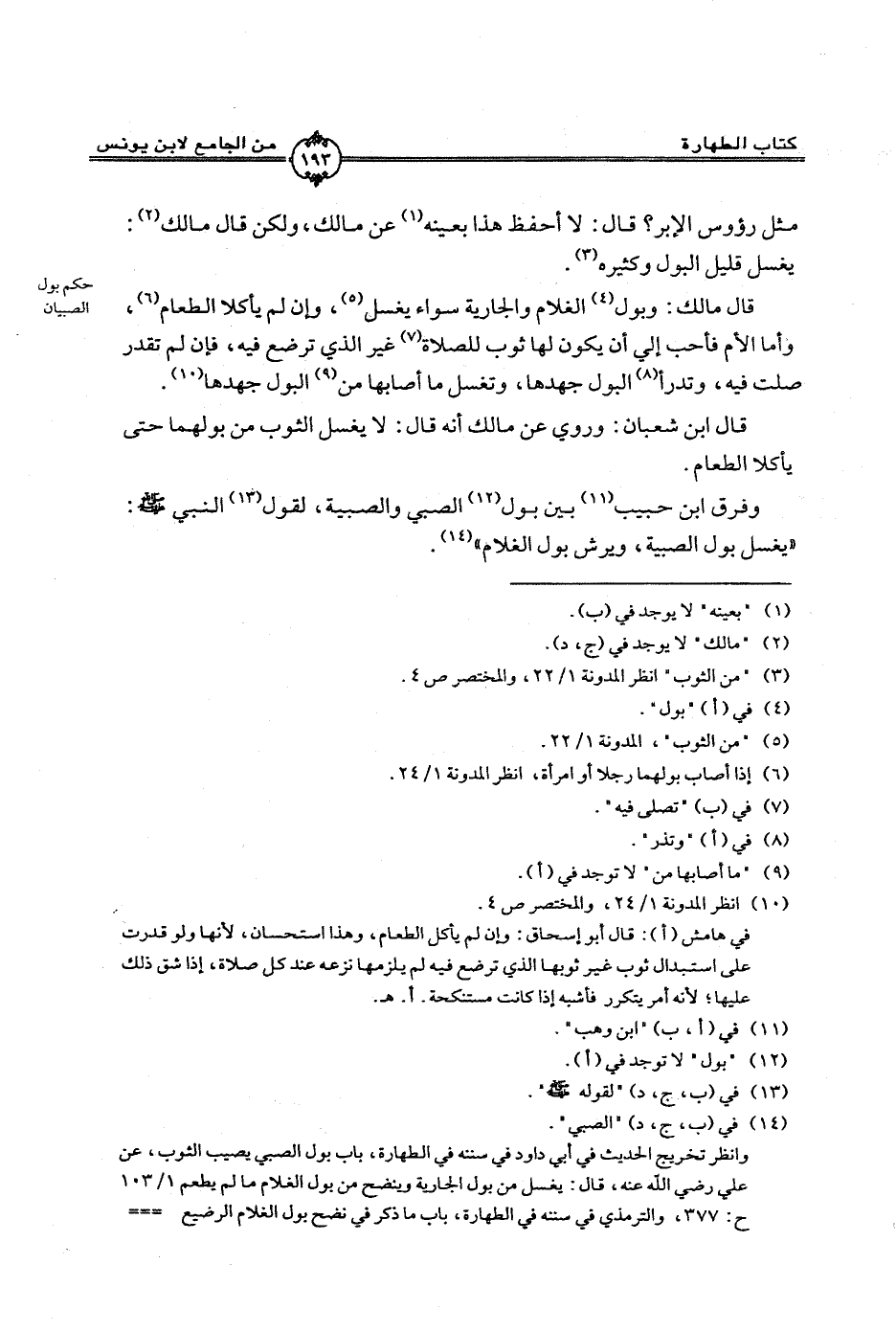 وفرق ابن حبيب بين بول الصبي والصبية، لقول النبي - صلى الله عليه وسلم -: "يغسل بول الصبية، ويرش بول الغلام"