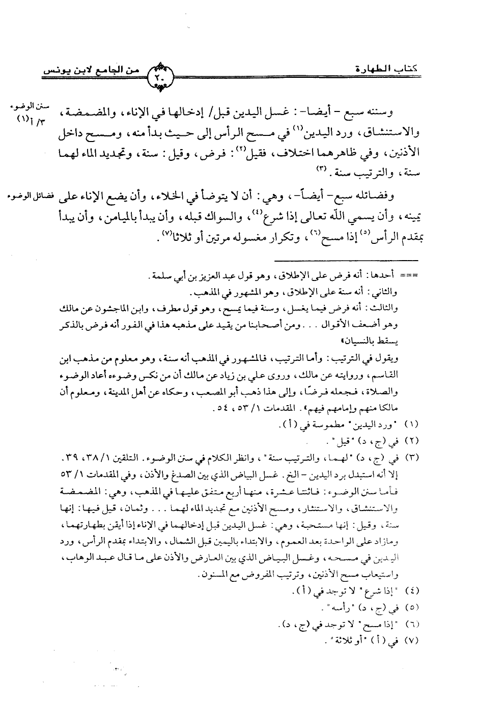 وسننه سبع- أيضاً: غسل اليدين قبل/ إدخالها في الإناء، والمضمد، والاستنشاق، ورد اليدين في مسح الرأس إلى حيث بدأ منه، ومسح داخل الإذنين، وفى ظاهرهما اختلاف، فقيل: فرض، وقيل: سنة، وتجيد الماء لهما سنة، والترتيب سنة.