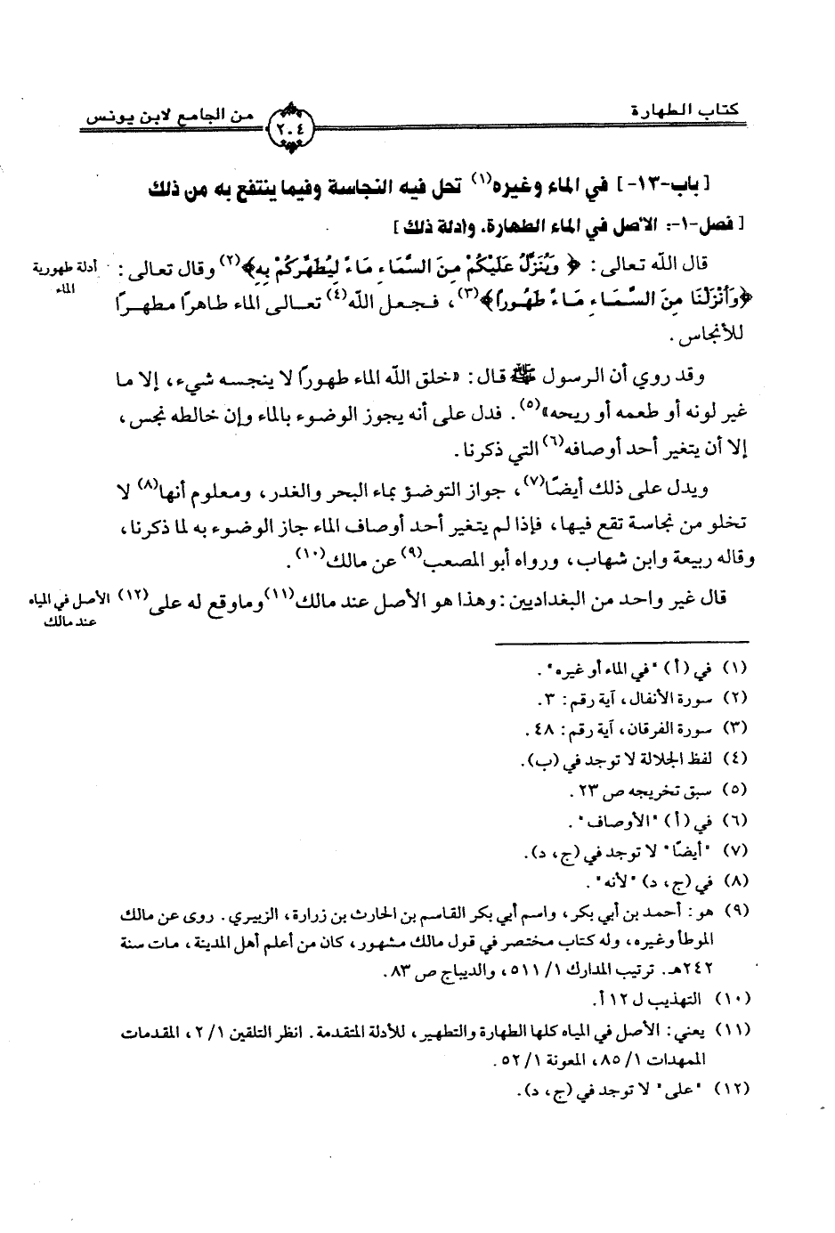 قال الله تعالى: (مِنْهُ وَيُنَزِّلُ عَلَيْكُمْ مِنَ السَّمَاءِ مَاءً لِيُطَهِّرَكُمْ بِهِ) وقال تعالى: (وَأَنْزَلْنَا مِنَ السَّمَاءِ مَاءً طَهُورًا)، فجهل الله (4) تعالى الماء طاهراً مطهراً للأنجاس