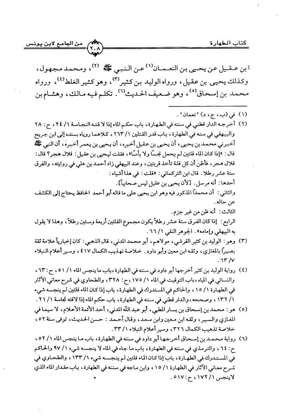 ابن عقيل عن يحيي بن النعمان عن النبي صلى الله عليه وسلم، ومحمد مجهول، وكذلك يحيي بن عقيل، ورواه الوليد بن كثير، وهو كثير الغلط، ورواه محمد بن إسحاق، وهو ضعيف الحديث. تكلم فيه مالك، وهشام بن