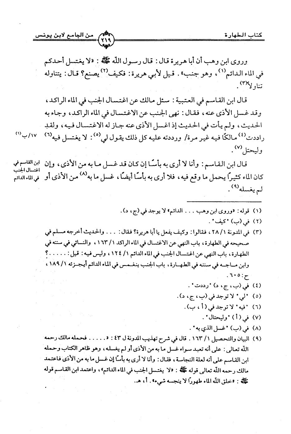 وروي ابن وهب أن أبا هريرة قال: قال رسول الله صلى الله عليه وسلم: ‹‹لا يغتسل أحدكم في الماء الدائم، وهو جنب››. قيل لأبي هريرة فكيف يصنع؟ قال: يتناوله تناولاً.