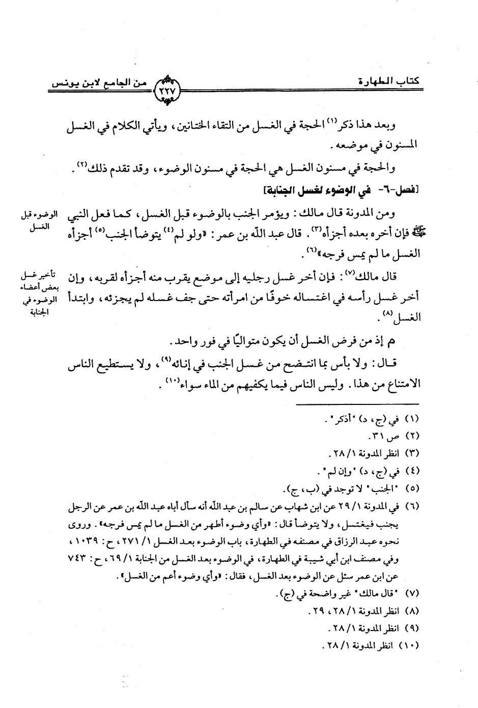 ومن المدونة قال مالك: ويؤمر الجنب بالوضوء قبل الغسل، كما فعل النبي صلى الله عليه وسلم فإن أخره بعده أجزأه. قال عبد الله بن عمر: ‹‹ولو لم يتوضأ الجنب أجزاه الغسل ما لم يمس فرجه››.