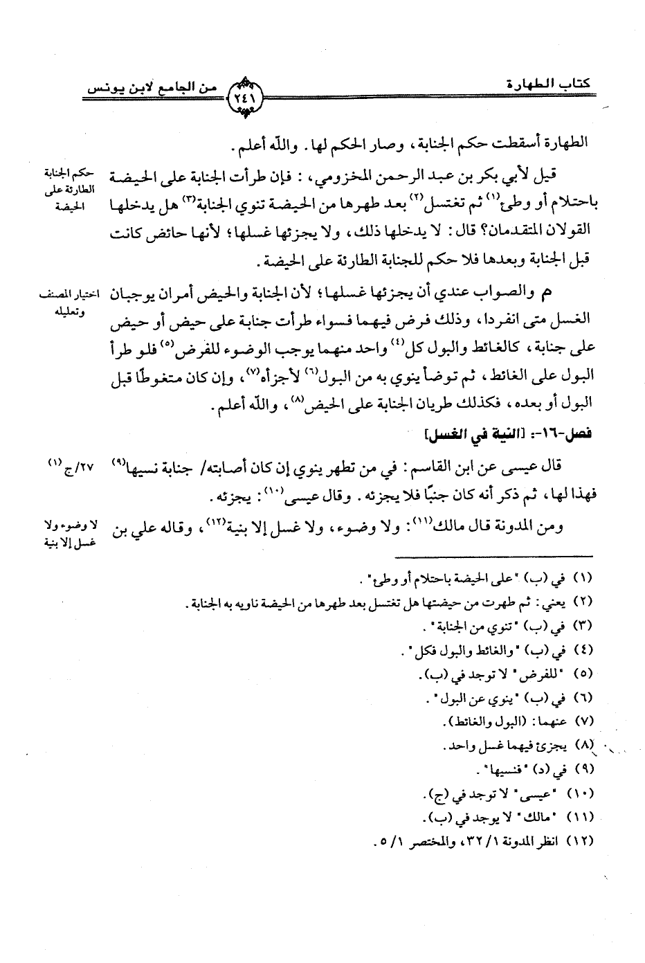 قيل لأبي بكر بن عبد الرحمن المخزومي،: فإن طرأت الجنابة على الحيضة باحتلام أو وطئ ثم تغتسل بعد طهرها من الحيضة تنوي الجنابة هل يدخلها القولان المتقدمان؟ قال: لا يدخلها ذلك، ولا يجزئها غسلها؛ لأنها حائض كانت قبل الجنابة وبعدها فلا حكم للجنابة أطارئة على الحيضة.