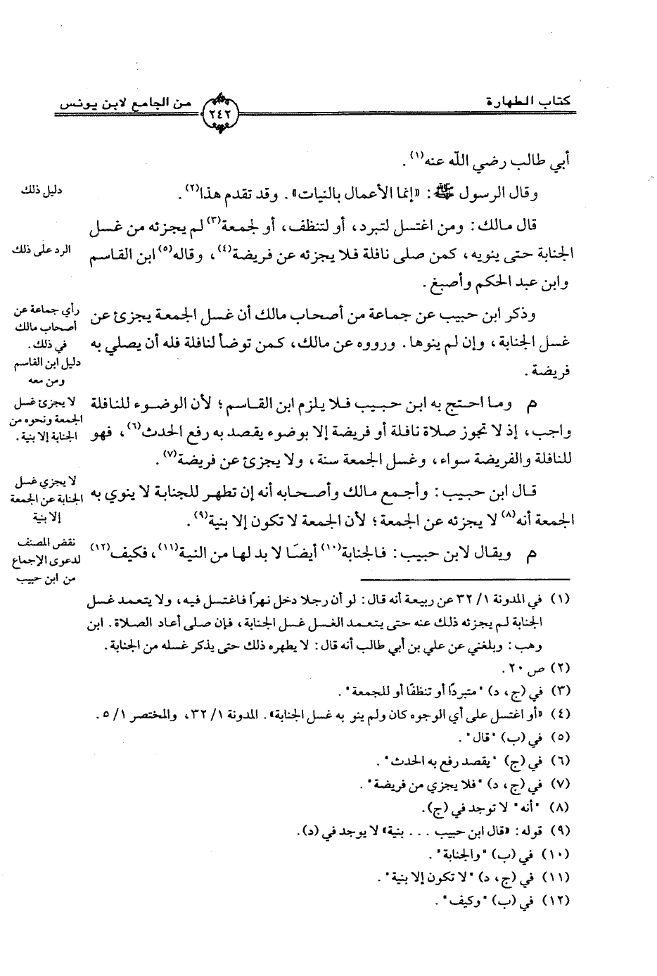 قال ابن حبيب: واجمع مالك وأصحابه أنه أن تطهر للجنابة لا ينوي به الجمعة أنه لا يجزئه عن الجمعة؛ لأن الجمعة لا تكون إلا بنية.