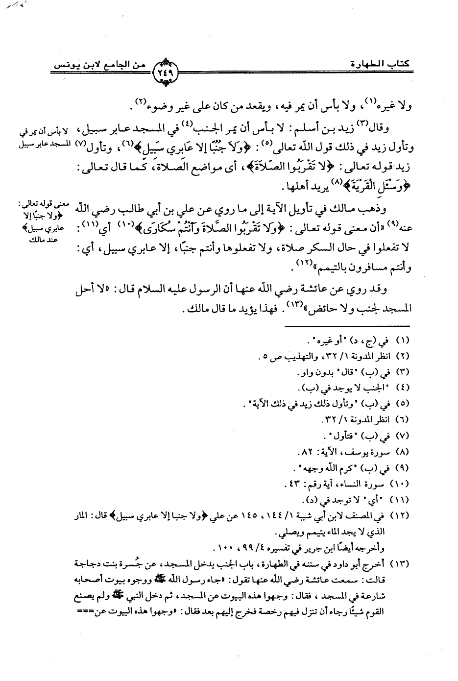 وقال زيد بن اسلم: لا بأس أن يمر الجنب في المسجد عابر سبيل، وتأول زيد في ذلك قول الله تعالى: {وَلا جُنُباً إِلاَّ عَابِرِي سَبِيلٍ {، وتأول زيد قوله تعالى: {لا تَقْرَبُوا الصَّلاةَ {، أي: مواضع الصلاة، كما قال تعالى: {وَاسْأَلْ الْقَرْيَةَ {يريد أهلها.