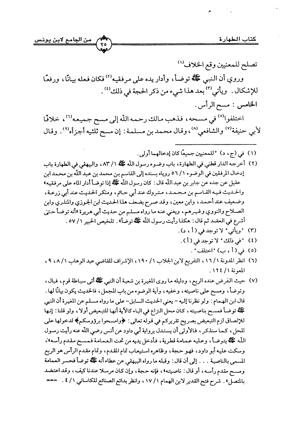 اختلفوا في مسحه، فذهب مالك رحمة الله إلى مسح جميعه، خلافاً لأبي حنيفة والشافعي، وقال محمد بن مسلمة: أن مسح ثلثيه أجزأه. وقال