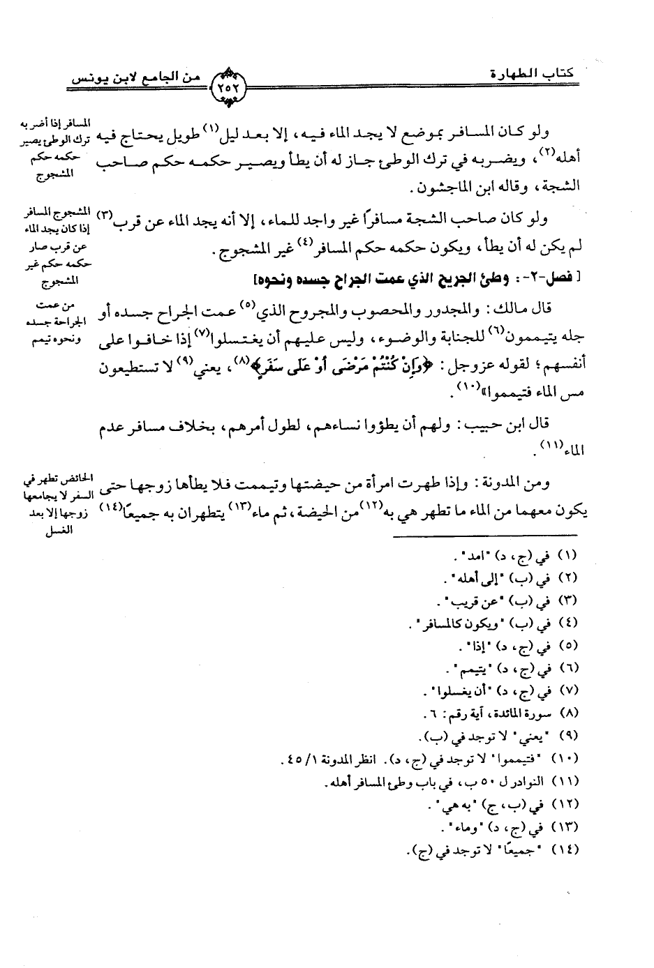 قال مال: والمجدور والمحصون والمجروح الذي عمت الجراح جسده أو جله يتيممون للجنابة والوضوء، وليس عليهم أن يغتسلوا أذا خافوا على أنفسهم؛ لقوله عز وجل: {وَإِنْ كُنْتُمْ مَرْضَى أَوْ عَلَى سَفَرٍ {، يعنى لا تستطيعون من الماء فتيمموا.