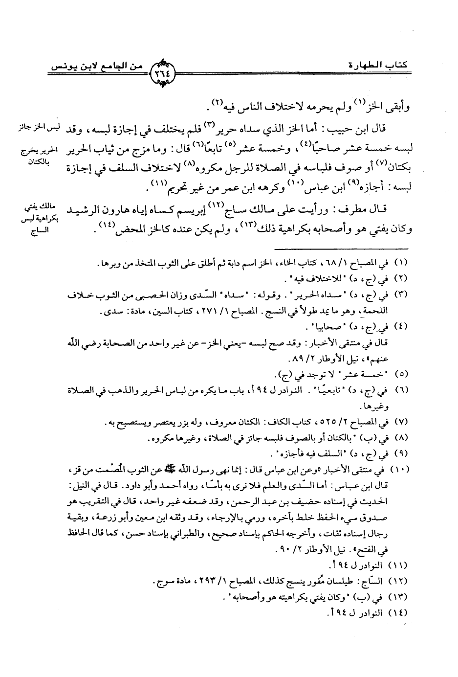 قال مطرف: ورأيت على مالك ساج إبريسم كساه هارون الرشيد وكان يفتي هو وأصحابه بكراهية ذلك، ولم يكن عنده كالخز المحض.