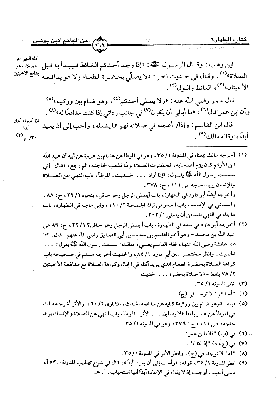 ابن وهب: وقال الرسول صلى الله عليه وسلم: ((إذا وجد أحدكم الغائط فليبدأ به قبل الصلاة)). وقال في حديث آخر: ((لا يصلِّى بحضرة الطعام ولا هو يدافعه الأخبثان))، الغائط والبول.