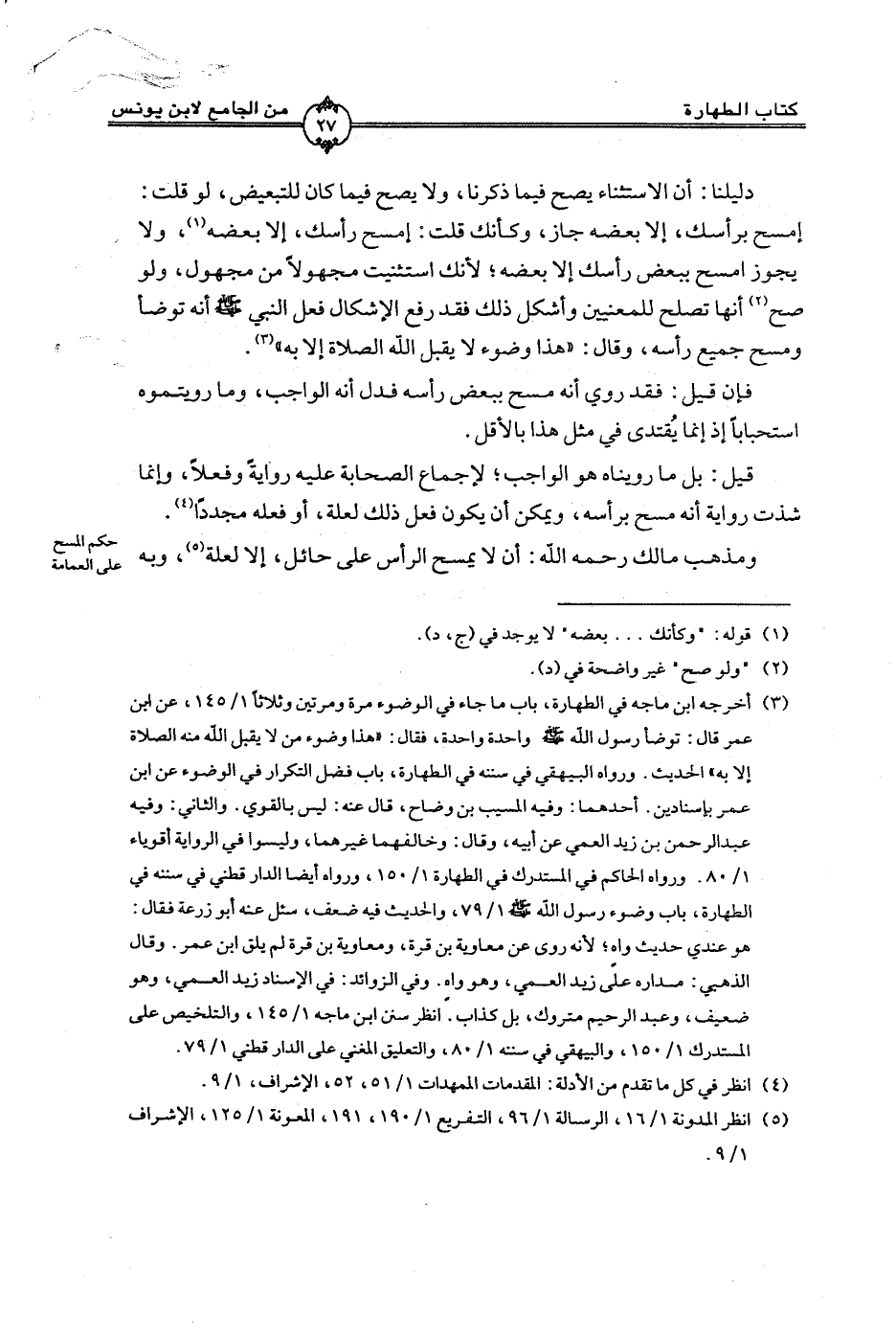 ومذهب مالك رحمه الله: أن لا يمسح الرأس على حائل، إلا لعلة، وبه