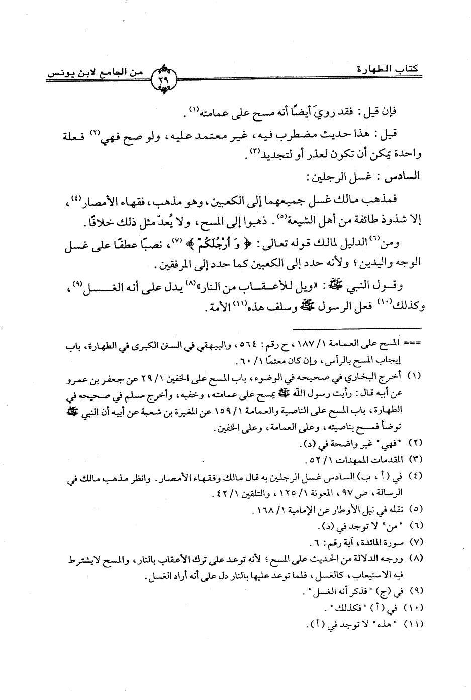 ومن الدليل لمالك قوله تعالى: {وَأَرْجُلَكُمْ {، نصباً عطفاً على غسل الوجه واليدين؛ ولىنه إلى الكعبين كما حدد إلى المرفقين.