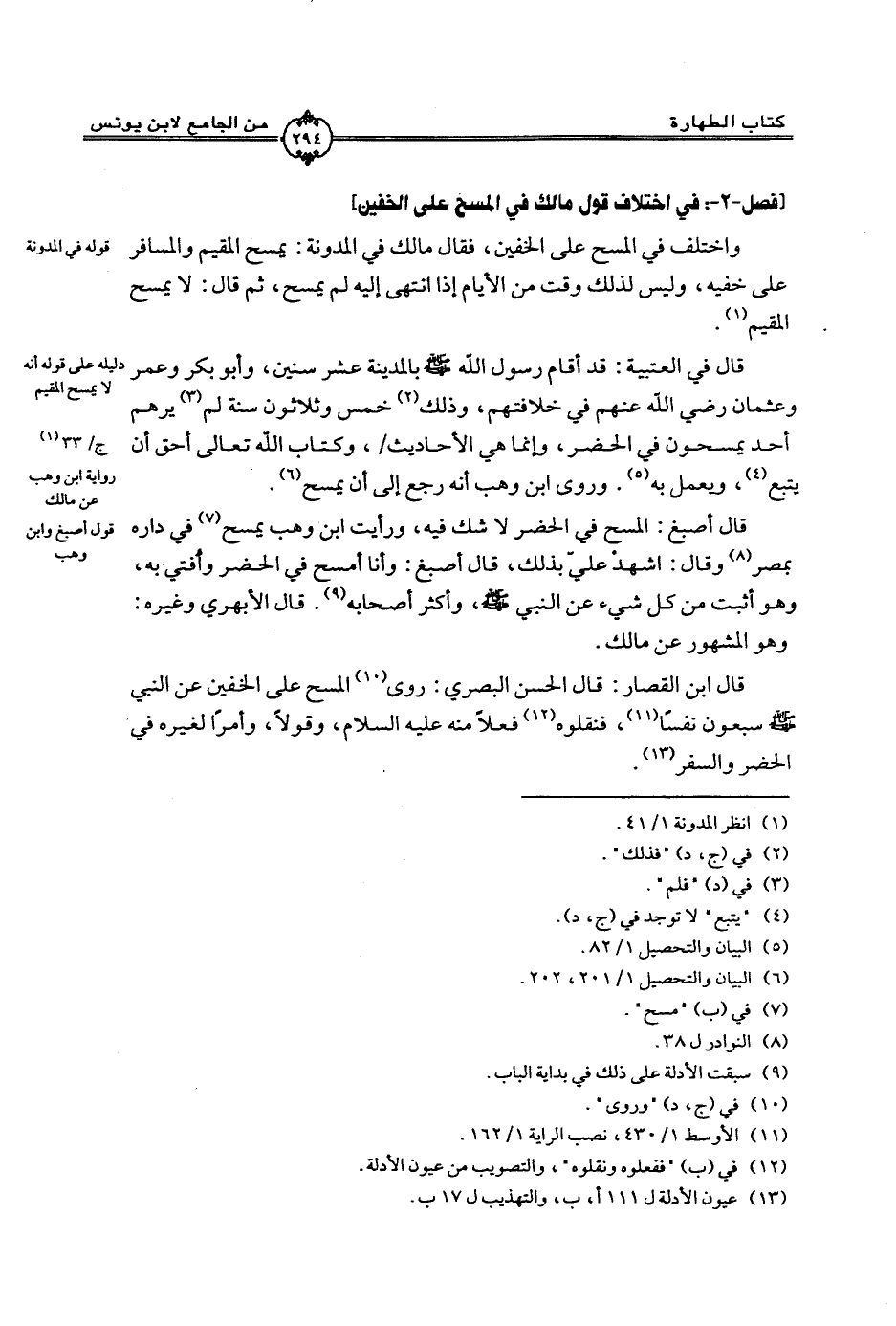 قال أصبغ: المسح في الحضر لا شك فيه، ورأيت ابن وهب يمسح في داره بمصر وقال: اشهد علي بذلك، قال أصبغ: وأنا أمسح في الحضر وأفتي به، وهو أثبت من كل شيء عن النبي صلى الله عليه وسلم، وأكثر أصحابه. قال الأبهري وغيره: وهو المشهور عن مالك.