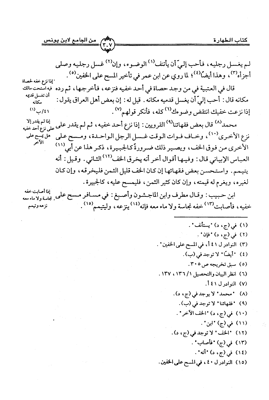 محمد قال بعض فقهائنا القرويين: إذا نزع أحد خفيه، ثم لم يقدر على نزع الأخرى، وخاف فوات الوقت غسل الرجل الواحدة، ومسح على الأخرى من فوق الخف، ويصير ذلك ضرورةً كالجبيرة، ذكر هذا عن أبى العباس الإبياني قال: وفيها أقوال أخر أنه يخرق الخف الثاني. وقيل: أنه يتيمم. واستحسن بعض فقهائنا إن كان الخف قليل الثمن فليخرقه، وغن كان لغيره، ويغرم له قيمته، وإن كان كثير الثمن، فليمسح عليه، كالجبيرة.