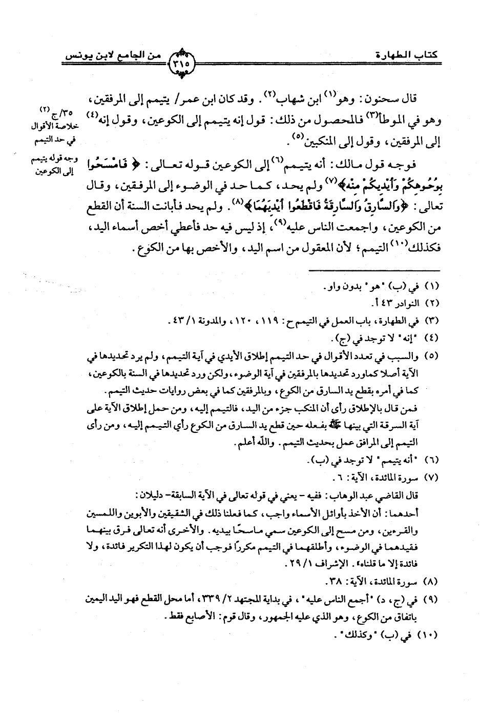 فوجه قول مالك: أنه يتيمم إلي الكوعين قوله تعالى: {فَامْسَحُوا بِوُجُوهِكُمْ وَأَيْدِيكُمْ مِنْهُ {[المائدة:6] ولم يحد, كما حد في الوضوء إلي المرفقين, وقال تعالى: {وَالسَّارِقُ وَالسَّارِقَةُ فَاقْطَعُوا أَيْدِيَهُمَا {[المائدة:38]. ولم يحد فأبانت السنة أن القطع من الكوعين, واجمعت الناس عليه, إذ ليس فيه حد فأعطي أخص أسماء اليد, فكذلك التيمم؛ لأن المعقول من اسم اليد, والأخص بها من الكوع.