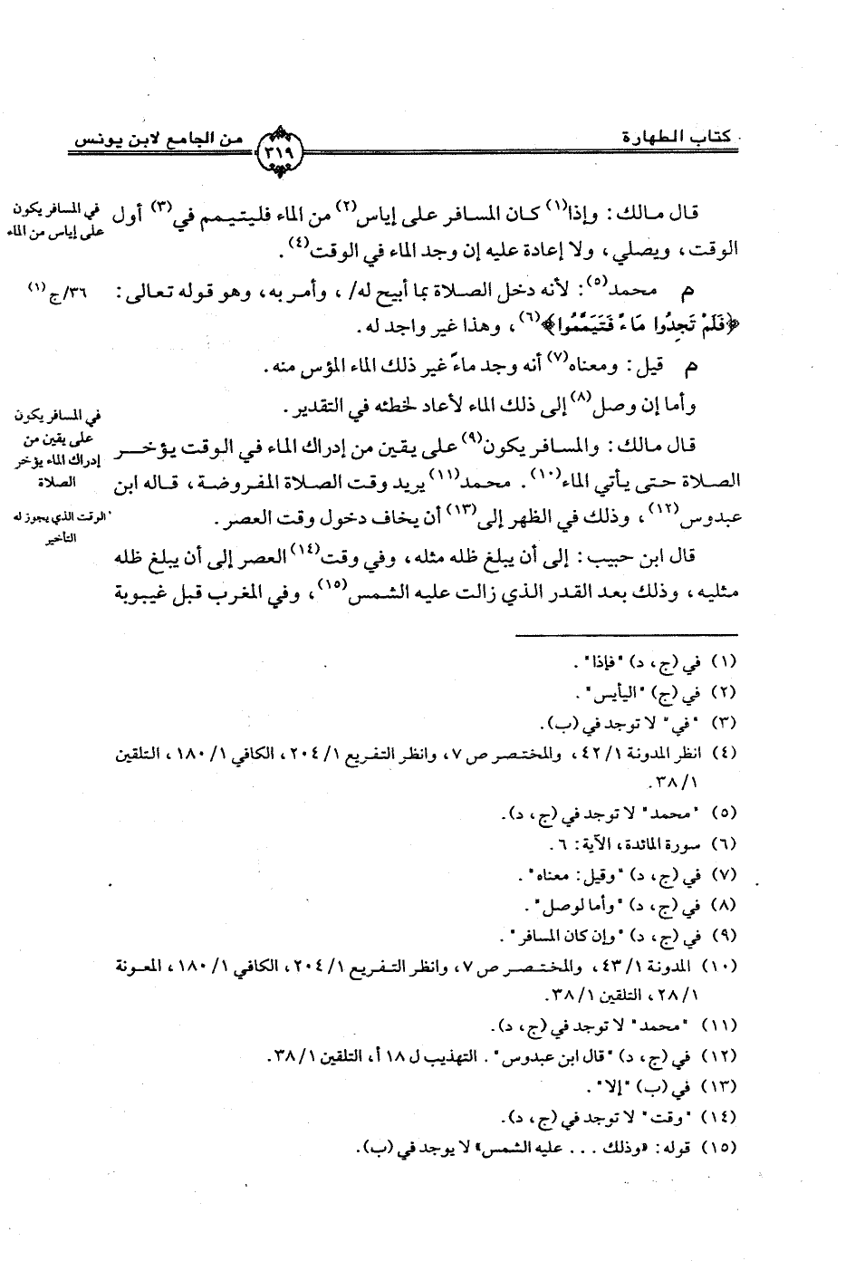 قال مالك: والمسافر يكون علي يقين من إدراك الماء في الوقت يؤخر الصلاة حتى يأتي الماء. محمد يريد وقت الصلاة المفروضة, قاله ابن عبدوس, وذلك في الظهر إلي أن يخاف دخول وقت العصر.