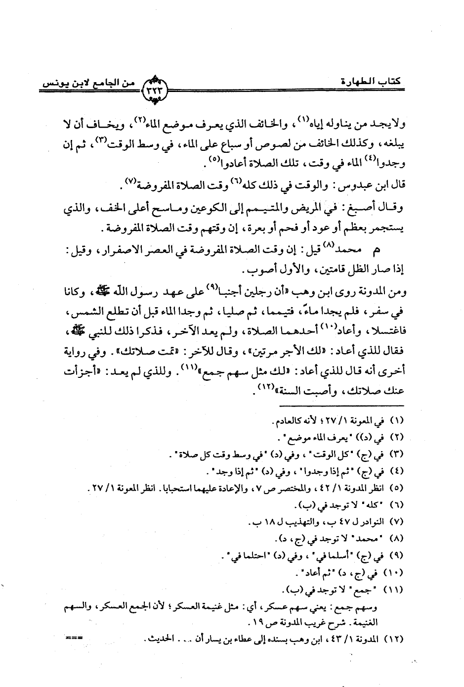 ومن المدونة روى ابن وهب ((أن رجلين أجنبا علي عهد رسول الله - صلى الله عليه وسلم - , وكانا في سفر, فلم يجدا ماءً, فتيمما, ثم صليا, ثم وجدا الماء قبل أن تطلع الشمس, فاغتسلا, وأعاد أحدهما الصلاة, ولم يعد الآخر, فذكرا ذلك للنبي - صلى الله عليه وسلم - , فقال للذي أعاد: ((لك الأجر مرتين)) , وقال للآخر: ((تمت صلاتك)). وفي رواية أخرى أنه قال للذي أعاد: ((لك مثل سهم جمع)). وللذي لم يعد: ((أجزأت عنك صلاتك, وأصبت السنة)).