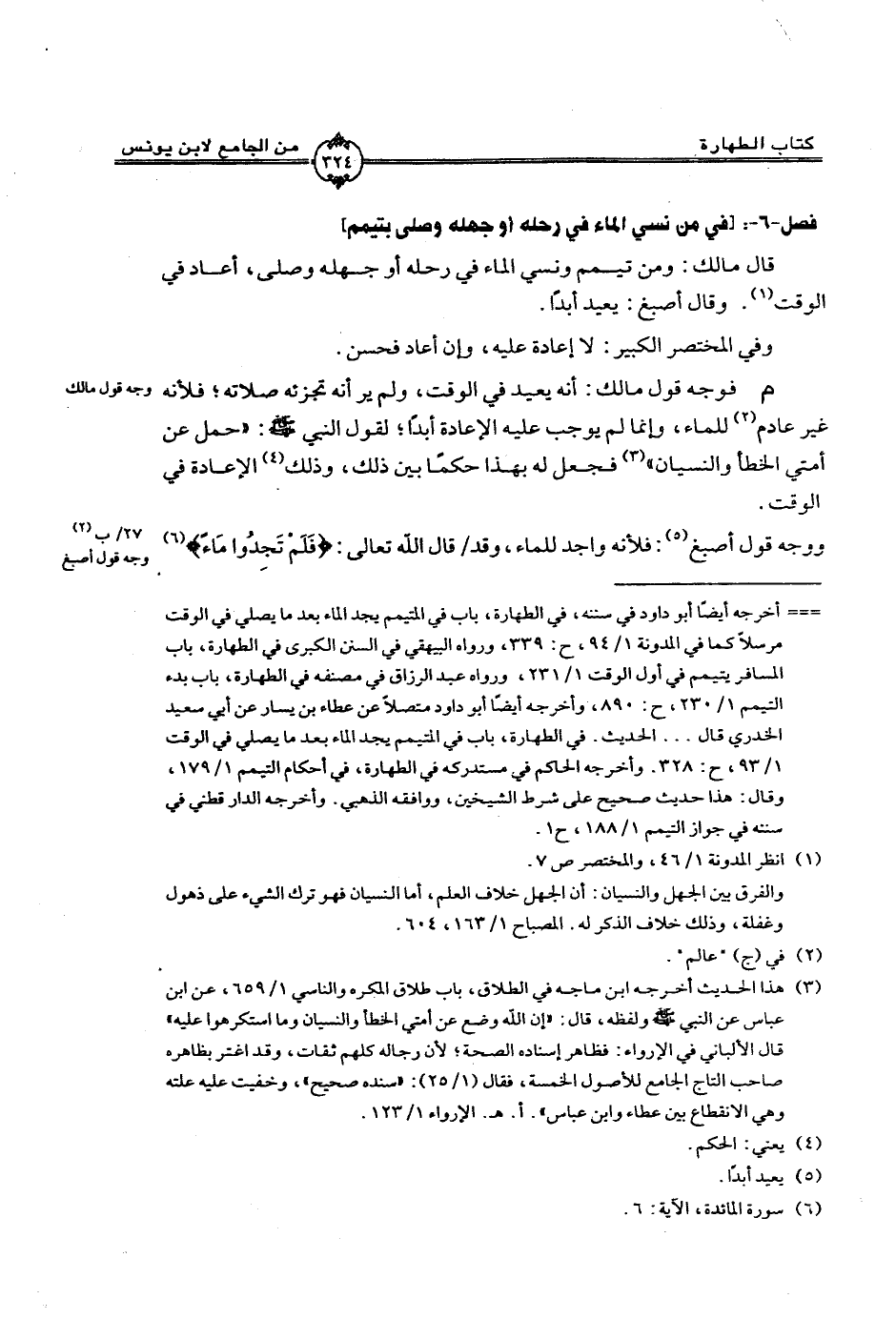 ووجه قول أصبغ: فلأنه واجد للماء, وقد/ قال الله تعالي: {فَلَمْ تَجِدُوا مَاءً