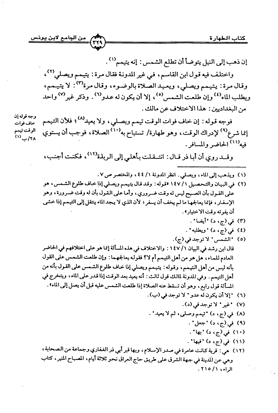 واختلف فيه قول ابن القاسم, في غير المدونة فقال مرة: يتيمم ويصلى, وقال مرة: يتيمم ويصلى, ويعيد الصلاة بالوضوء, وقال مرة: لا يتيمم, ويطلب الماء وإن طلعت الشمس, إلا أن يكون له عدو. وذكر غير واحد من البغداديين: هذا الاختلاف عن مالك.