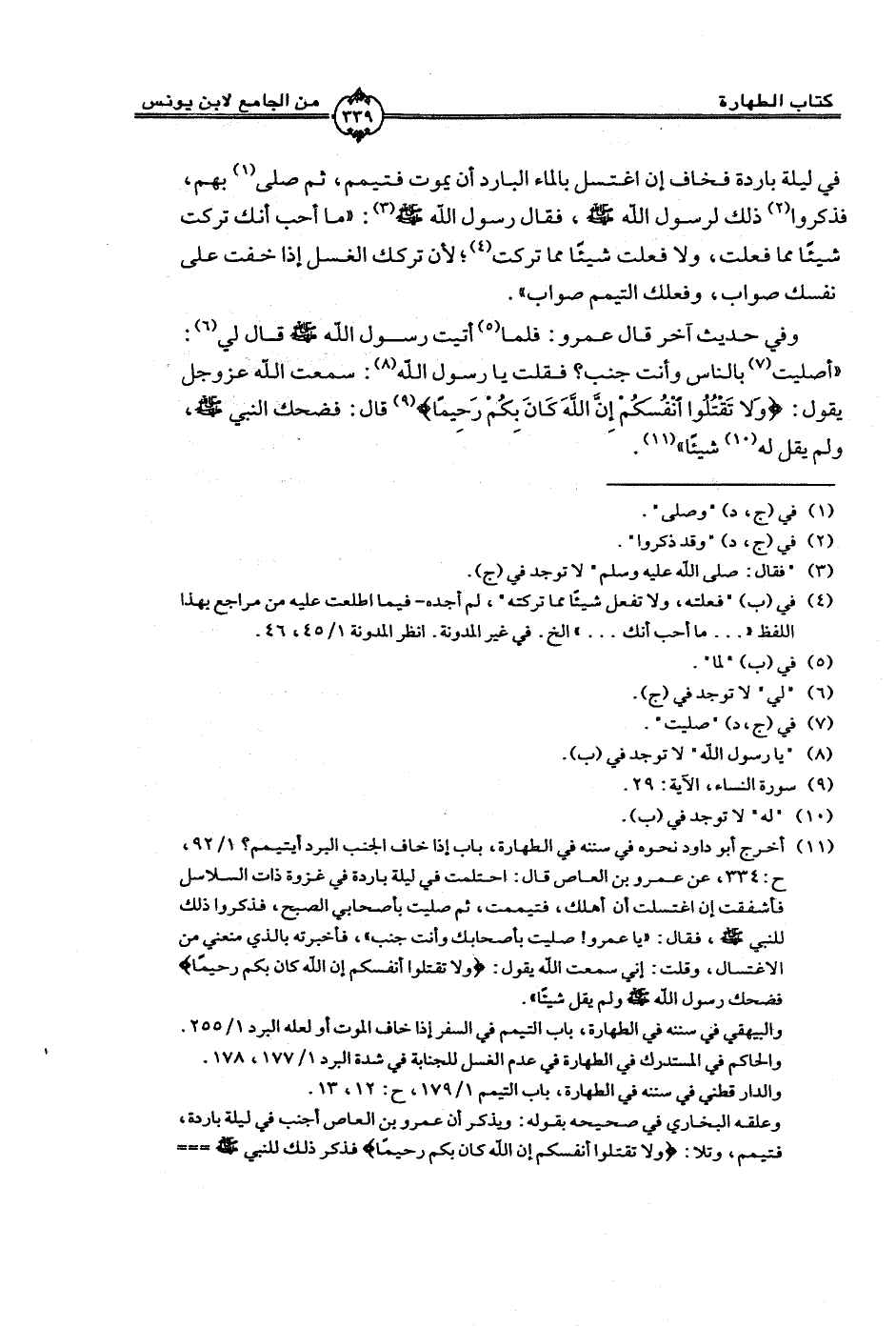 وفي حديث آخر قال عمرو: فلما أتيت رسول الله صلى الله عليه وسلم قال لي: "أصليت بالناس وأنت جنب؟ فقلت يا رسول الله: سمعت الله عز وجل يقول: (وَلا تَقْتُلُوا أَنفُسَكُمْ إِنَّ اللَّهَ كَانَ بِكُمْ رَحِيمًا) قال: فضحك النبي صلى الله عليه وسلم ولم يقل له شيئًا".