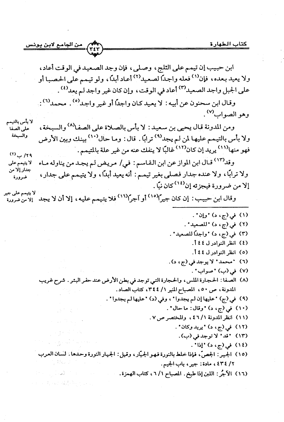 ابن حبيب إن تيمم على الثلج، وصلى، فإن وجد الصعيد في الوقت أعاد، ولا يعيد بعده، فإن فعله واجداً لصعيد أعاد أبداً، ولو تيمم على الحصبا أو على الجبل واجد الصعيد أعاد في الوقت، وإن كان غير واجد لم يعد.