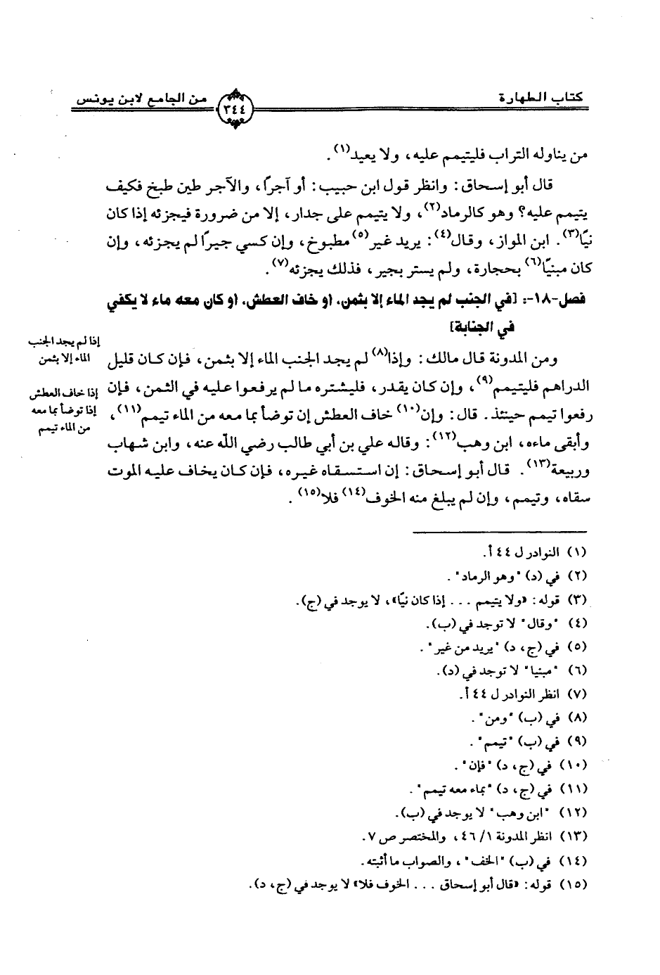 ومن المدونة قال مالك: وإذا لم يجد الجنب الماء إلا بثمن، فإن كان قليل الدراهم فليتيمم، وإن كان يقدر، فليشتره ما لم يرفعوا عليه في الثمن، فإن رفعوا تيمم حينئذ. قال: وإن خاف العطش إن توضأ بما معه من الماء تيمم، وأبقى ماءه، ابن وهب: وقاله علي بن أبي طالب رضي الله عنه، وابن شهاب وربيعة. قال أبو إسحاق: إن استسقاه غيره، فإن كان يخاف عليه الموت سقاه، وتيمم، وإن لم يبلغ منه الخوف فلا.