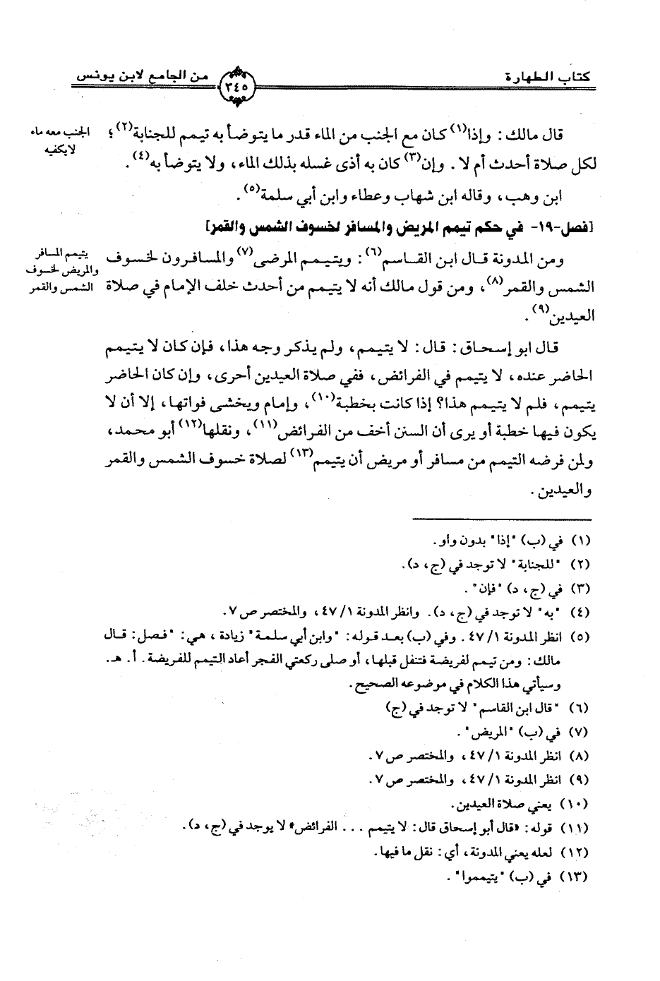 قال أبو إسحاق: قال: لا يتيمم، ولم يذكر وجه هذا، فإن كان لا يتيمم الحاضر عنده، لا يتيمم في الفرائض، ففي صلاة العيدين أحرى، وإن كان الحاضر يتيمم، فلم لا يتيمم هذا؟ إذا كانت بخطبة، وإمام ويخشى فواتها، إلا أن لا يكون فيها خطبة أو يرى أن السنن أخف من الفرائض، ونقلها أبو محمد، ولمن فرضه التيمم من مسافر أو مريض أن يتيمم لصلاة خسوف الشمس والقمر والعيدين.