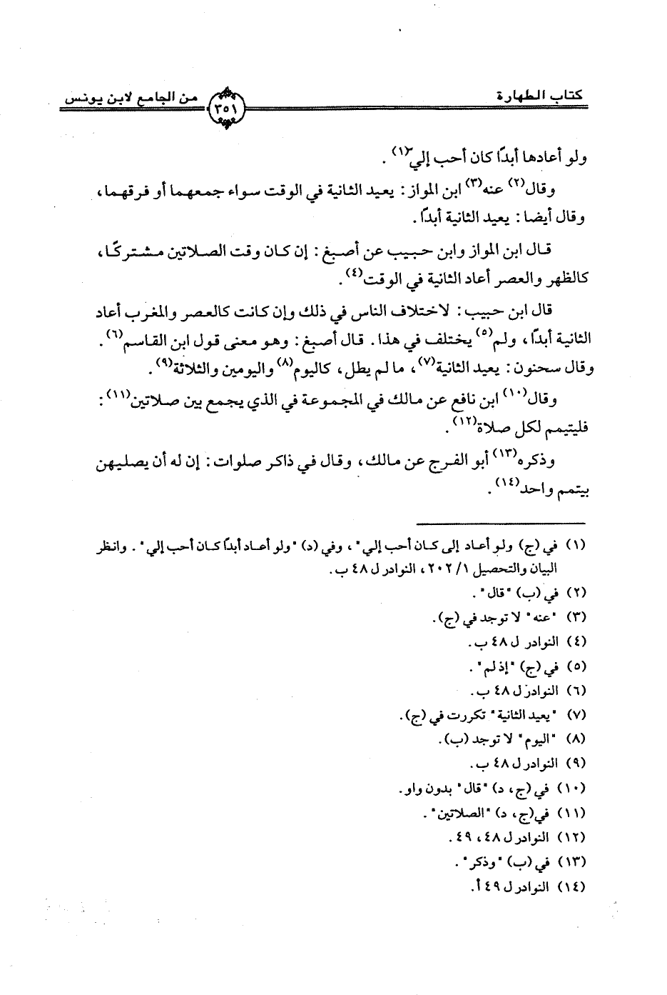 وقال عنه ابن المواز: يعيد الثانية في الوقت سواء جمعهما أو فرقهما، وقال أيضا: يعيد الثانية أبداً.