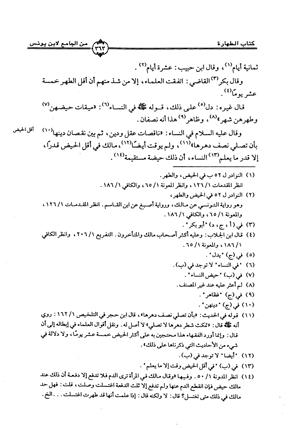 وقال عليه السلام في النساء:‹‹ناقصات عقل ودين، ثم بين نقصان دينها بأن تصلي نصف دهرها››، ولم يوقت أيضًا، مالك في أقل الحيض قدرًا، إلا قدر ما يعلم النساء، أن ذلك حيضة مستقيمة.