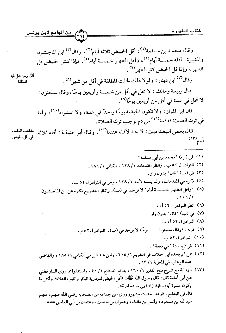 وقال محمد بن مسلمة: أقل الحيض ثلاثة أيام، وقال ابن الماجشون والمغيرة: أقله خمسة أيام، وأقل الطهر خمسة أيام، وإذا كثر الحيض قل الطهر، وإذا قل الحيض كثر الطهر.