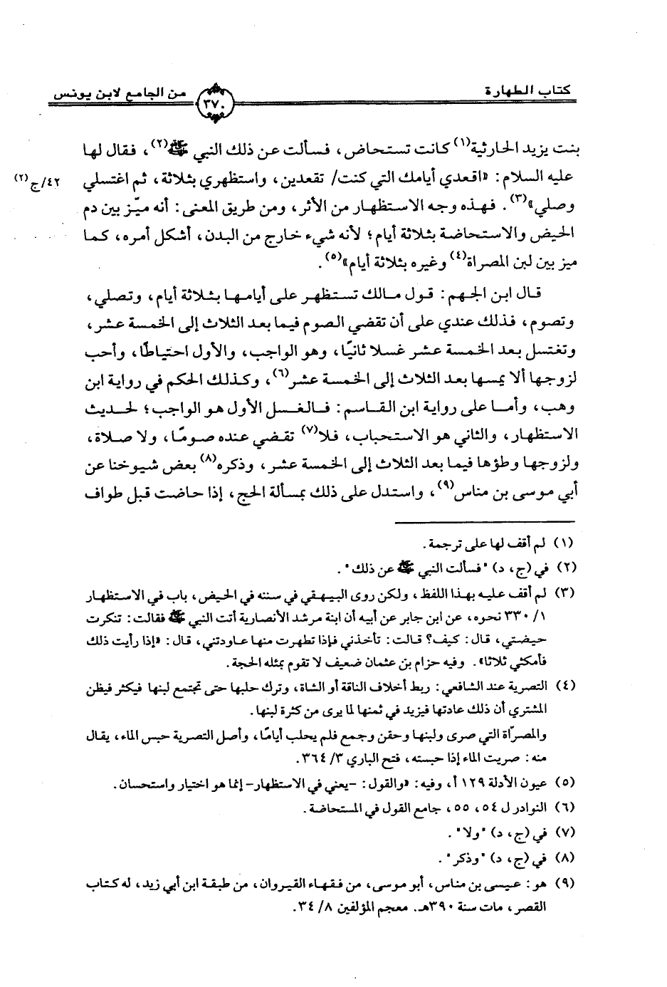 قال ابن الجهم: قول مالك تستظهر على أيامها بثلاثة أيام، وتصلي، وتصوم، فذلك عندي على أن تقضي الصوم فيما بعد الثلاث إلى الخمسة عشر، وتغتسل بعد الخمسة عشر غسلا ثانيًا، وهو الواجب، والأول احتياطًا، وأحب لزوجها ألا يمسها بعد الثلاث إلى الخمسة عشر، وكذلك الحكم في رواية ابن وهب، وأما على رواية ابن القاسم: فالغسل الأول هو الواجب؛ لحديث الاستظهار، والثاني هو الاستحباب، فلا تقضي عنده صومًا، ولا صلاة، ولزوجها وطؤها فيما بعد الثلاث إلى الخمسة عشر، وذكره بعد شيوخنا عن أبي موسى بن مناس، واستدل على ذلك بمسألة الحج، إذا حاضت قبل طواف