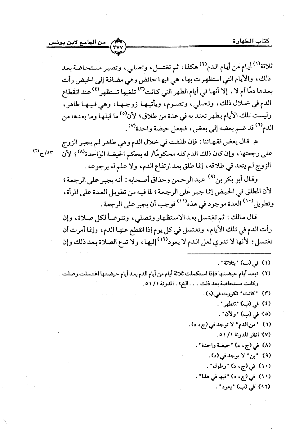 ثلاثة أيام من أيام الدم هكذا، ثم تغتسل، وتصلي، وتصير مستحاضة بعد ذلك، والأيام التي استظهرت بها، عي فيها حائض وهي مضافة إلى الحيض رأت بعدها دمًا أم لا، إلا أنها في أيام الطهر التي كانت تلغيها تستظهر عند انقطاع الدم في خلال ذلك، وتصلي، وتصوم، ويأتيها زوجها، وهي فيها طاهر، وليست تلك الأيام بطهر تعتد به في عدة من طلاق؛ لأن ما قبلها وما بعدها من الدم قد ضم بعضه إلى بعض، فجعل حيضة واحدة.