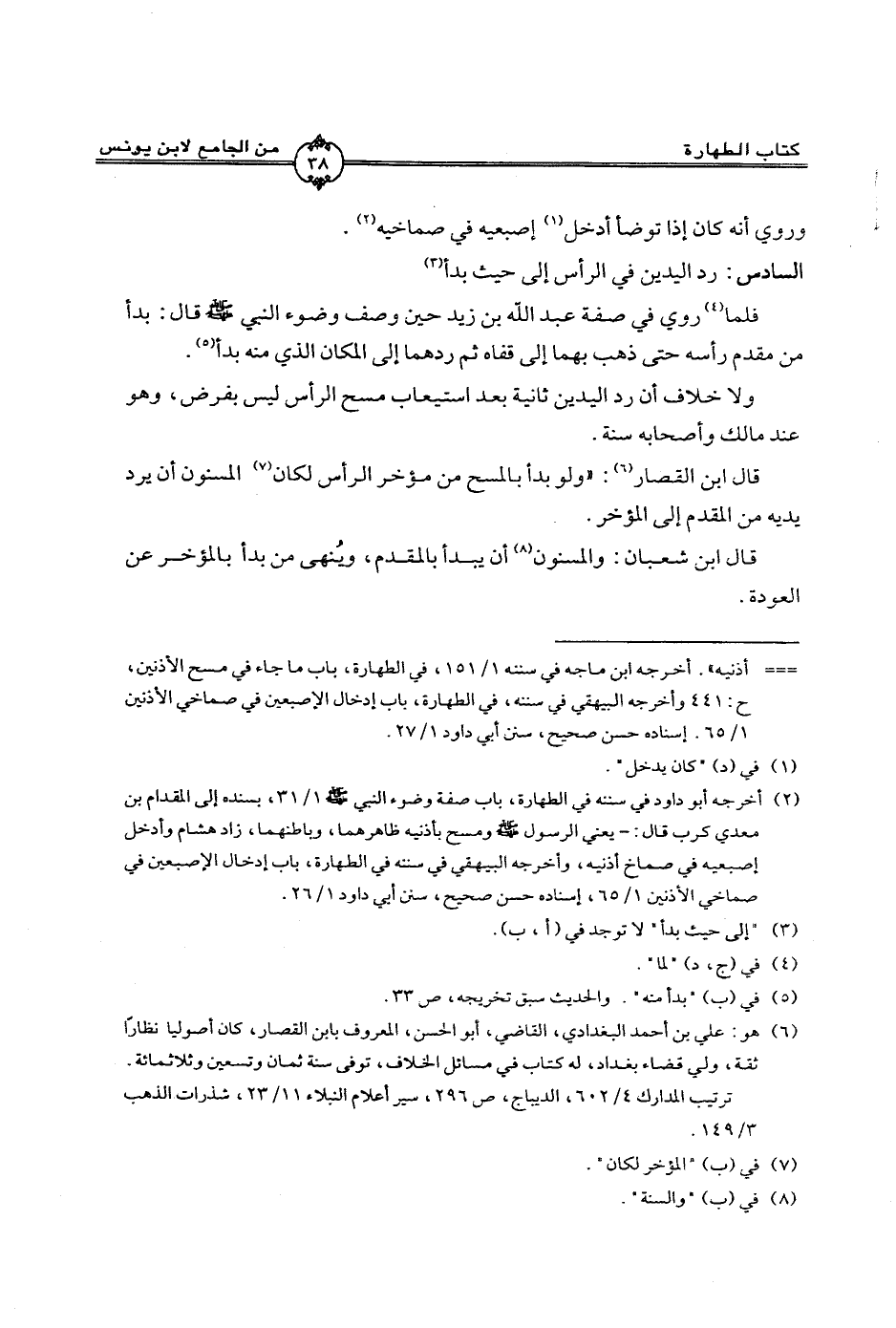 فلما روى في صفة عبد الله بن زيد حين وصف وضوء النبي - صلى الله عليه وسلم - قال: بدأ من مقدم رأسه حتى ذهب بهما إلى قفاه ثم ردهما إلى المكان الذي منه بدأ.