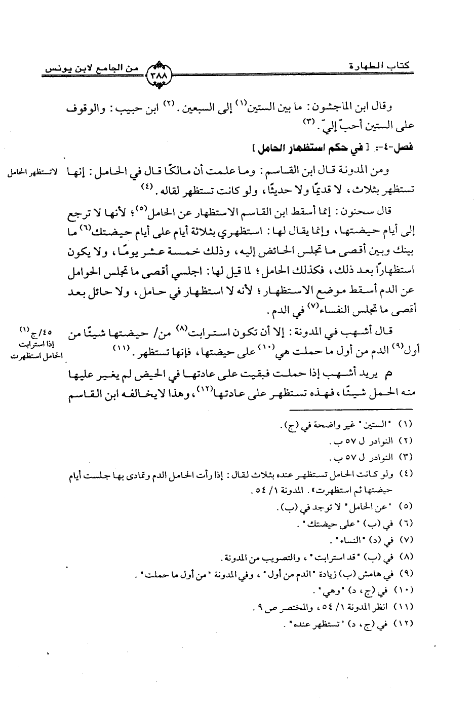ومن المدونة قال ابن القاسم: وما علمت أن مالكًا قال في الحامل: إنها تستظهر بثلاث، لا قديمًا ولا حديثًا، ولو كانت تستظهر لقاله.