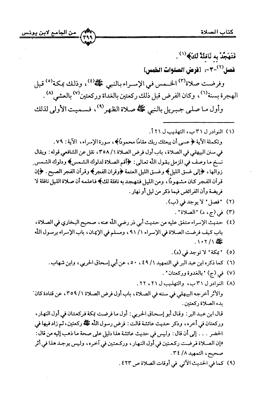 وفرضت صلاة الخمس في الإسراء بالنبي صلى الله عليه وسلم، وذلك بمكة قبل الهجرة سنة، وكان الفرض قبل ذلك ركعتين بالغداة وركعتين بالعشي.