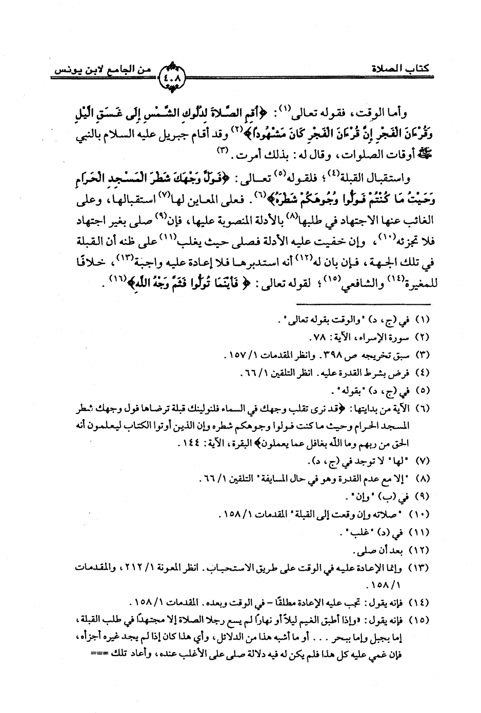 وأما الوقت، فقوله تعالى: (أَقِمِ الصَّلاةَ لِدُلُوكِ الشَّمْسِ إِلَى غَسَقِ اللَّيْلِ وَقُرْآنَ الْفَجْرِ إِنَّ قُرْآنَ الْفَجْرِ كَانَ مَشْهُودًا) وقد أقام جبريل عليه السلام بالنبي صلى الله عليه وسلم أوقات الصلوات، وقال له: بذلك أمرت.