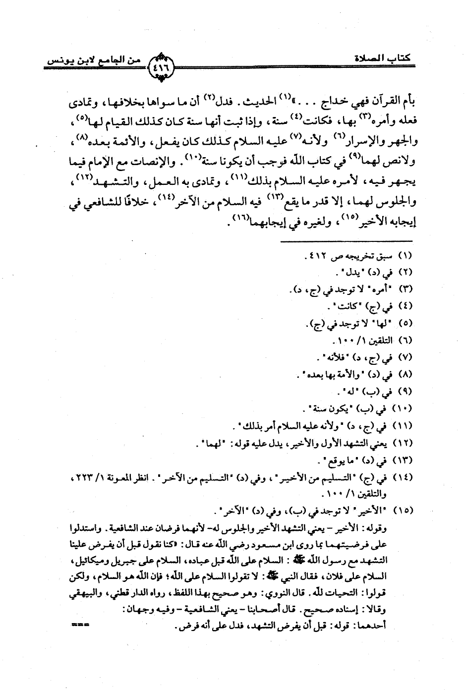 بأم القرآن فهي خداج ...)) الحديث. فدل أن ما سواها بخلافها، وتمادى فعله وأمره بها، فكانت سنة، وإذا ثبت أنها سنة كان كذلك القيام لها، والجهر والإسرار ولأنه عليه السلام كذلك كان يفعل، والأئمة بعده، ولا نص لهما في كتاب الله فوجب أن يكونا سنة. والإنصات مع الإمام فيما يجهر فيه، لأمره عليه السلام بذلك، وتمادى به العمل، والتشهد، والجلوس لهما، إلا قدر ما يقع فيه السلام من الآخر، خلافًا للشافعي في إيجابه الأخير، ولغيره في إيجابهما.