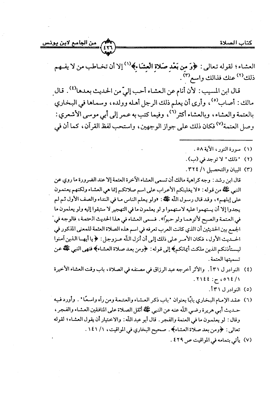 قال ابن المسيب: لأن أنام عن العشاء أحب إلي من الحديث بعدها. قال مالك: أصاب، وأرى أن يعلم ذلك الرجل أهله وولده، وسماها في البخاري بالعتمة والعشاء، وبالعشاء أكثر، وفيما كتب به عمر إلى أبي موسى الأشعري: وصل العتمة فكان ذلك على جواز الوجهين، واستحب لفظ القرآن، كما أن في